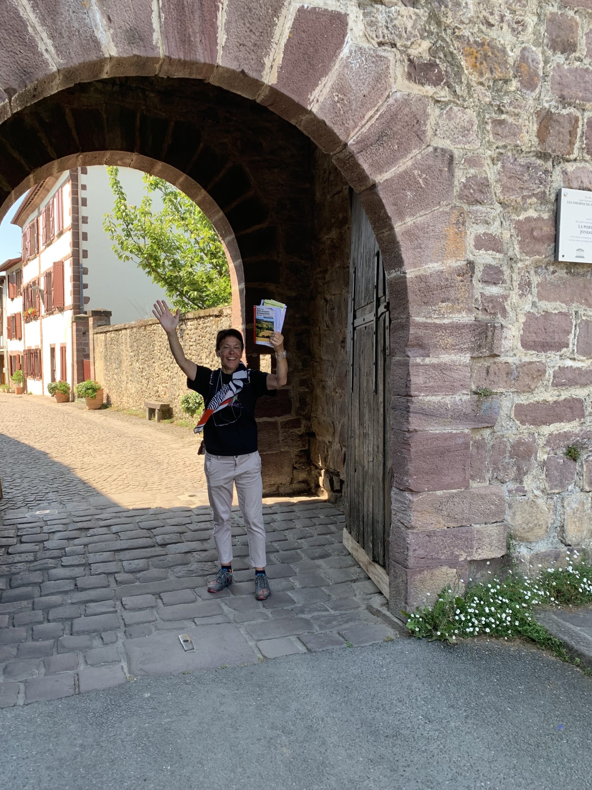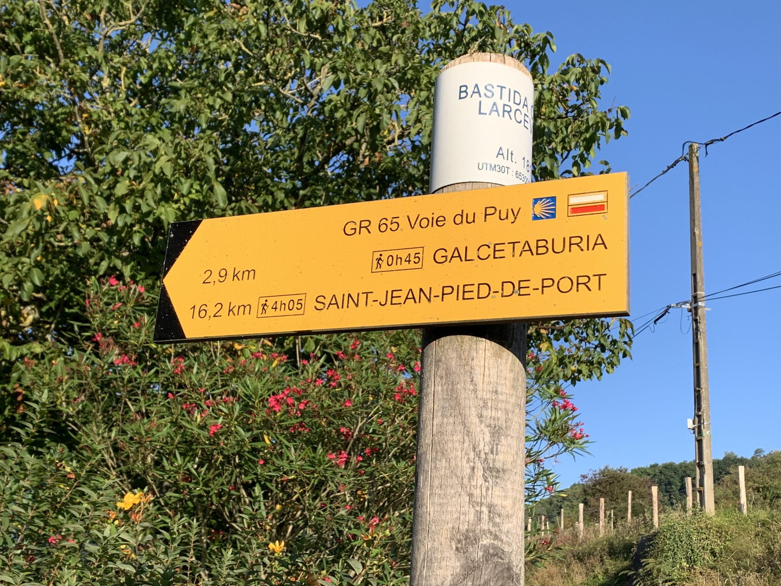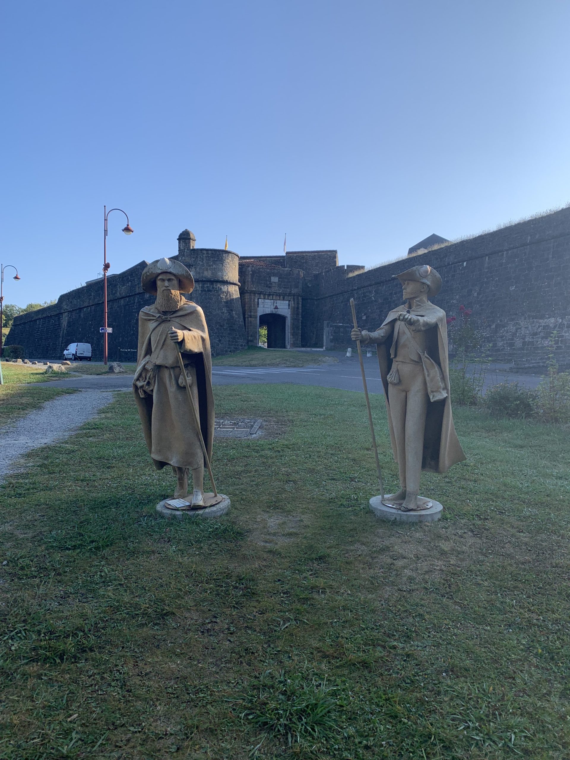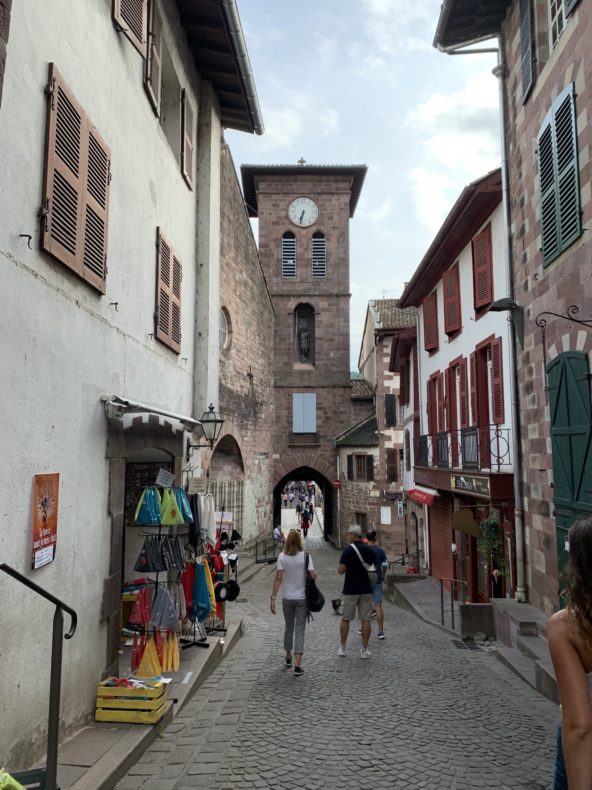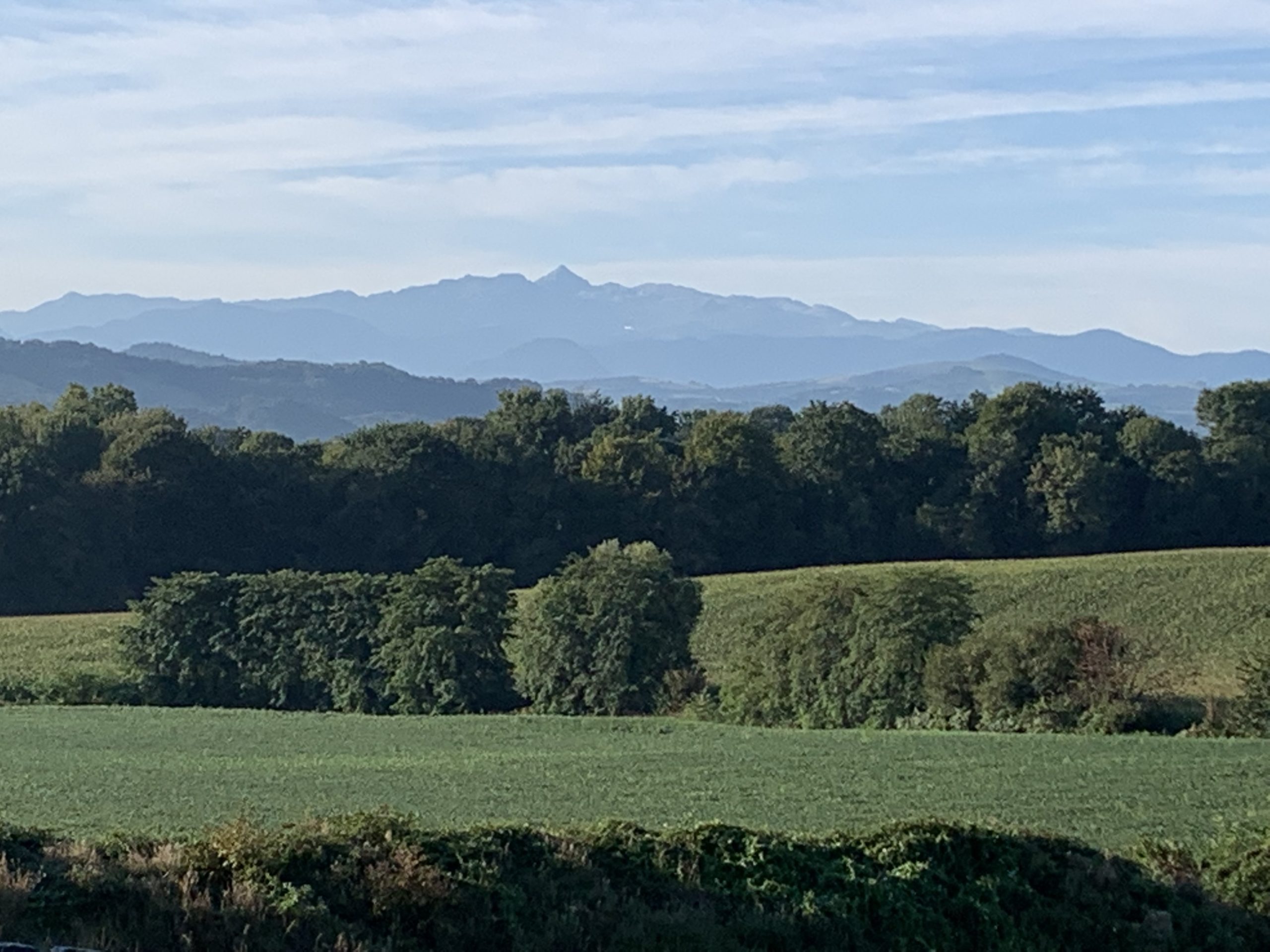 Nous voilà arrivées à la dernière étape de notre périple. Nous avons 19km à parcourir. Après un petit déjeuner copieux dans notre maison d’hôtes au milieu de nulle part. Notre hôte très sympathique nous amène au départ du Gr. Il fait un peu frais mais le ciel est magnifique. La chaîne des Pyrénées se détache au fond. Notre chemin longe une grande route très passante qui mène à St Jean. Mais nous avons les indications pour suivre le Gr. Aujourd’hui nous ne sommes pas toutes seules. Nous suivons ou dépassons d’autres pèlerins . Nous en avons déjà rencontré certains, mais d’autres viennent se joindre au groupe. Le paysage est sublime. Entre les cloches des vaches , les bêlements des moutons nous sommes en pleine nature. Nous voyons aussi deux ânes et des chevaux. Après un arrêt casse croûte, nous nous rapprochons de St Jean. Il y a d’abord St Jean le vieux . Notre but est maintenant à 4km. Les maisons basques toutes blanches aux volets rouges foncés et colombages se font de plus en nombreuses. Nous entrons dans St Jean par la porte St Jacques. Nous voici donc au bout de notre marche. Nous avons parcouru 145km en 8 jours. Nous sommes fières de notre exploit. Demain repos et visite de la ville avant de rentrer sur Paris Jeudi avec des images de paysages plein la tête.