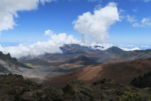 Hale’a’kala veut dire la maison du soleil et aujourd’hui il porte bien son nom. Il ne fait pas chaud à 2855m. Nous enfilons donc un pull et peut commencer la séance de photos. Quelques nuages blancs commencent à occuper le cratère ce qui fait que le paysage change au gré des vents. De ce fait nous découvrons de nouveaux pitons et cônes à chaque instant. Il nous reste encore une dernière étape : le sommet proprement dit qui culmine à 3055m. De la on peut voir par beau temps Big Island. Aujourd’hui on la devine. Les nuages se font de plus en plus nombreux et noirs . Il est l’heure de redescendre…