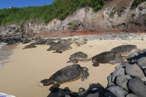 Un bref instant de récupération à Makawao, et nous repartons vers notre hòtel. Sur la route du retour une pancarte indique un point de vue et de nombreuses voitures y stationnent. Nous décidons d’en faire autant. Et c’est une bonne idée. Nous admirons dans un premier temps les surfeurs venus défier les vagues de l’océan. Ils sont nombreux à s’adonner à ce sport. Quand tout à coup nous apercevons en bas une foule de curieux qui se massent sur la plage. Curieuses, nous allons y faire et tour. Et là, nous découvrons des dizaines de tortues à l’abri d’un petit muret. Et il en arrive encore…Elles sont venues pour pondre et font l’admiration des badauds. Séance photo obligatoire.