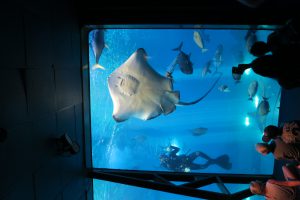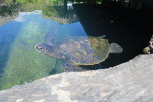 Arrivées à l’ouverture de l’aquarium, nous pouvons découvrir et admirer toutes les espèces de poissons que l’on peut trouver dans les îles Hawaïennes. Il y en a de toutes sortes. Je retrouve certains poissons que j’ai vu à la Réunion. Le plus intéressant est le tunnel aux requins. Nous sommes entourées de requins mais aussi de poissons grands ou petits et d’énormes raies mania. Elles sont si gracieuses… Nous prenons notre temps pour les admirer. Nous allons ensuite au lagon des tortues. Mais il n’y en a que 4 et nous sommes un peu déçues.