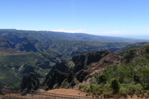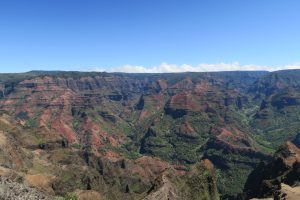 Nous arrivons enfin au Waimea Canyon Lookout. Il y a un peu de touristes sur le parking, mais il est encore tôt et cela reste raisonnable. Nous gravissons les quelques marches qui nous séparent du sommet du point de vue. Le spectacle est saisissant de beauté. Les pentes abruptes du canyon sont de couleur verte et rouge. Des cascades jaillissent du haut du canyon. Ce serait le 2eme plus grand canyon américain apres le grand Canyon. Aujourd’hui le temps est magnifique et nous restons un bon moment pour admirer ce magnifique endroit. Je pense que c’est l’un des plus beaux sites d’Hawaii et qui fait que j’aime beaucoup Kauai.