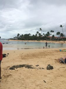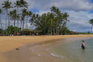 Comme d’habitude à Kauai, le sable est blanc et fin et dans la mer il n’y a pas de rochers. Aucun problème non plus pour rentrer dans l’eau. Elle est chaude. Quel bon bain!! Cela fait du bien car il fait très chaud aujourd’hui.