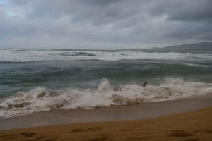 De retour à l’hôtel, les effets d’Olivia commencent à se faire sentir. Sur la plage de nombreux badauds viennent voir les vagues qui déferlent sur la plage. C’est très impressionnant. Bientôt le ciel se couvre de gros nuages gris et une grosse pluie se met à tomber. Il est temps de rentrer se mettre a l’abri.