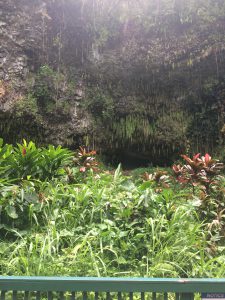 Ce jeudi 13, il ne fait pas beau. Olivia a apporté des trombes d’eau dans la nuit et beaucoup de vent. Mais pas de gros dégâts sur l’Ile, Néanmoins la balade en bateau que nous avions prévue est maintenue bien que la petite riviere Wailea , qui ne fait que 31km de long, soit devenue de couleur marron et charrie pas mal de branchages. Après un arrêt photo au Opaeka’a falls, nous rejoignons notre bateau. Le capitaine nous explique un peu d’histoire hawaiienne. Nous débarquons sur une crique. Après avoir traversé une forêt exubérante d’arbres et de fleurs nous arrivons a la ferme aux fougères Fern Grotto. Là nous attendent des musiciens et danseurs hawaiiens qui nous chantent un chant typique pendant que nous admirons les cascades qui descendent du haut de la grotte et recouvrent les fougères. Ils nous raccompagnent sur le bateau, nous faisant partager leurs chants et danses. Nous avons le droit a une séance d’initiation au Hula la danse traditionnelle. Les gestes sont très gracieux et sont en rapport avec la nature. Après cela, nous reprenons la voiture pour descendre un peu au Sud voir le Spouting Horn. C’est une cavité dans les rochers d’où sort un geyser plus ou moins puissant, selon la force des vagues, en faisant un bruit assourdissant.