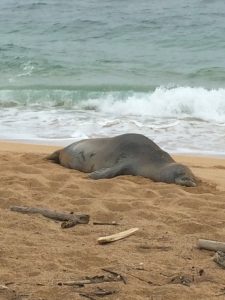 Nous traversons ensuite le domaine qui est agrémenté d’arbres fruitiers : agrumes, mangues, pommiers et ananas. Le train revient à son point de départ et nous reprenons la voiture. Direction : les Waimea Falls . Une petite route sinueuse nous y amène. Il y a un peu de monde. La route s’arrête là donc demi tour et rentrée a l’hôtel pour un bain dans la piscine. Pour rentrer nous passons par le bord de mer . Il y a un phoque qui se repose sur la plage. Son nom est K13. C’est Elle a été mordue par un requin et s’en est sortie miraculeusement. Un périmètre de sécurité est délimité pour ne pas la déranger .