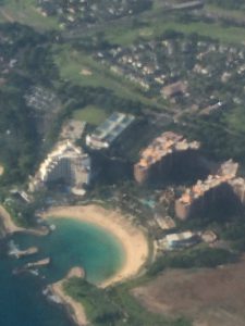 Nous reprenons notre avion Hawaiian Airlines pour un vol de 45 mn. Nous allons passer au dessus de 2 îles Molokai et Oahu avant d’arriver. Nous voyons trés nettement les eaux transparentes de Molokai avant de survoler Waikiki et Pearl Harbour. Kauai est a 110 km.