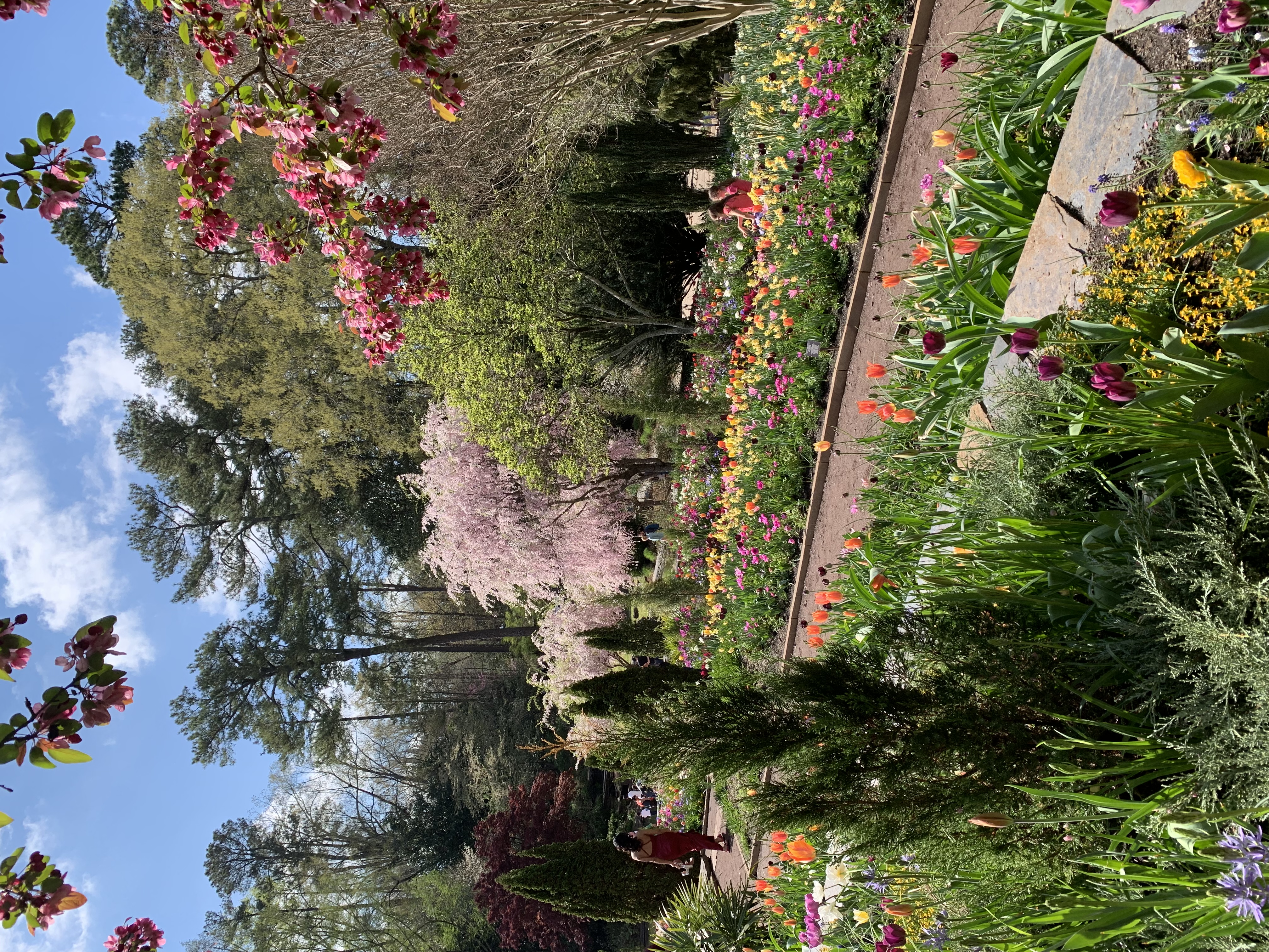 Aujourd’hui c’est le bal de promo de Ludmila. Elle doit se faire toute belle et se pomponner. C’est un evenement très important aux USA. Il se passe à la fin de l’année de terminale et avant l’entrée à l’université. Les jeunes gens tirés à 4 épingles viennent chercher les jeunes filles à la maison avec un bracelet de fleurs. Ce ne sera pas le cas pour Ludmila. Elle rejoindra toute sa troupe pour faire des photos en haut d’un Building. Par chance, le temps s’est arrangé et aujourd’hui nous voyons le soleil se pointer. Nous la laissons se préparer tranquille. Nicolas a allumé son four à pizza dans le jardin. Il les a préparé lui même et elles sont excellentes. Entre temps Joshua est rentré de ses cours. Cet après-midi sera consacré à la visite de Duke garden qui se trouve non loin de la. Les garçons semblent peu intéressés. Le Duke’ s garden se trouve au milieu de l’université de Duke qui est très réputée en Caroline du Nord. Nous nous dirigeons vers le côté asiatique. Des érables du Japon , des pins de toutes sortes, des magnolias et des camélias bordent les allées en terre battue. Au détour d’un chemin, nous apercevons un lac avec un petit pont rouge comme celui de Nikko mais en plus petit. Mais le clou du spectacle est un parterres de tulipes de toutes les couleurs. Il y en a des milliers. Tous les parterres se rejoignent vers une glycine en pleine floraison avec ses branches chargées de fleurs roses, c’est vraiment magnifique.